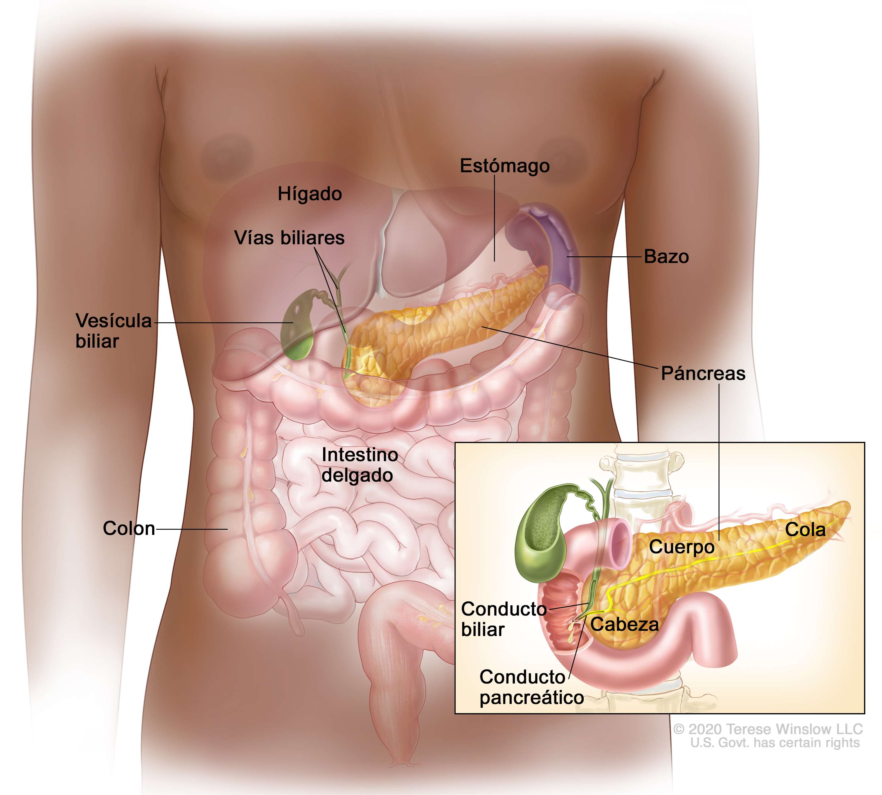 El páncreas es una glándula que mide alrededor de seis pulgadas de largo y se ubica en el abdomen. Está rodeada por el estómago, el intestino delgado, el hígado, el bazo, y la vesícula biliar. Tiene la forma de una pera plana. El extremo ancho del páncreas se llama la cabeza las secciones medias son el cuello y el cuerpo y el extremo delgado es la cola. El proceso unciforme es la parte de la glándula que se dobla hacia atrás y por debajo de la cabeza del páncreas. La cola se encuentra en el lado izquierdo del cuerpo, mientras que la cabeza y el proceso unciforme se encuentran en el derecho. Hay tres vasos sanguíneos importantes que cruzan detrás del páncreas; la arteria mesentérica superior, la vena mesentérica superior y la vena porta.
