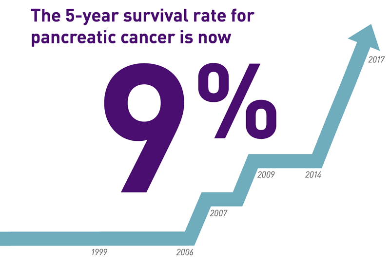 The five-year survival rate for pancreatic cancer currently sits at a meager 9 percent, but we know by working together, we can change this statistic. We need more funding, more awareness and more people talking about this disease. Every voice matters!