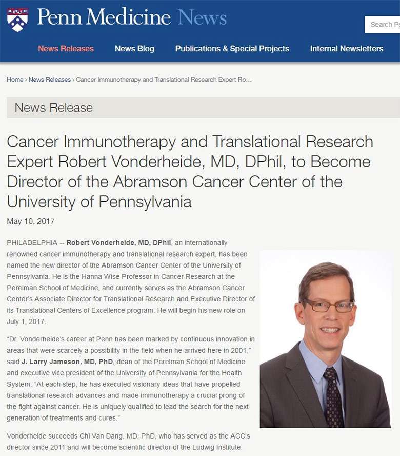 Congratulations to our Scientific & Medical Advisory Board (SMAB) member and Research Acceleration Network (RAN) grantee Robert Vonderheide, MD, DPhil, for being named as the new director of the Abramson Cancer Center of the University of Pennsylvania.