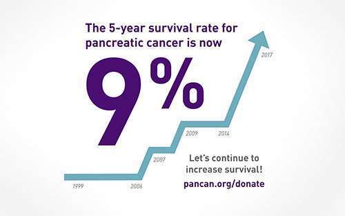 The five-year survival rate for the disease increased, moving from 8 to 9 percent!* This is the third straight year that the five-year survival rate has climbed, moving us one step closer to achieving our goal to double survival by 2020.